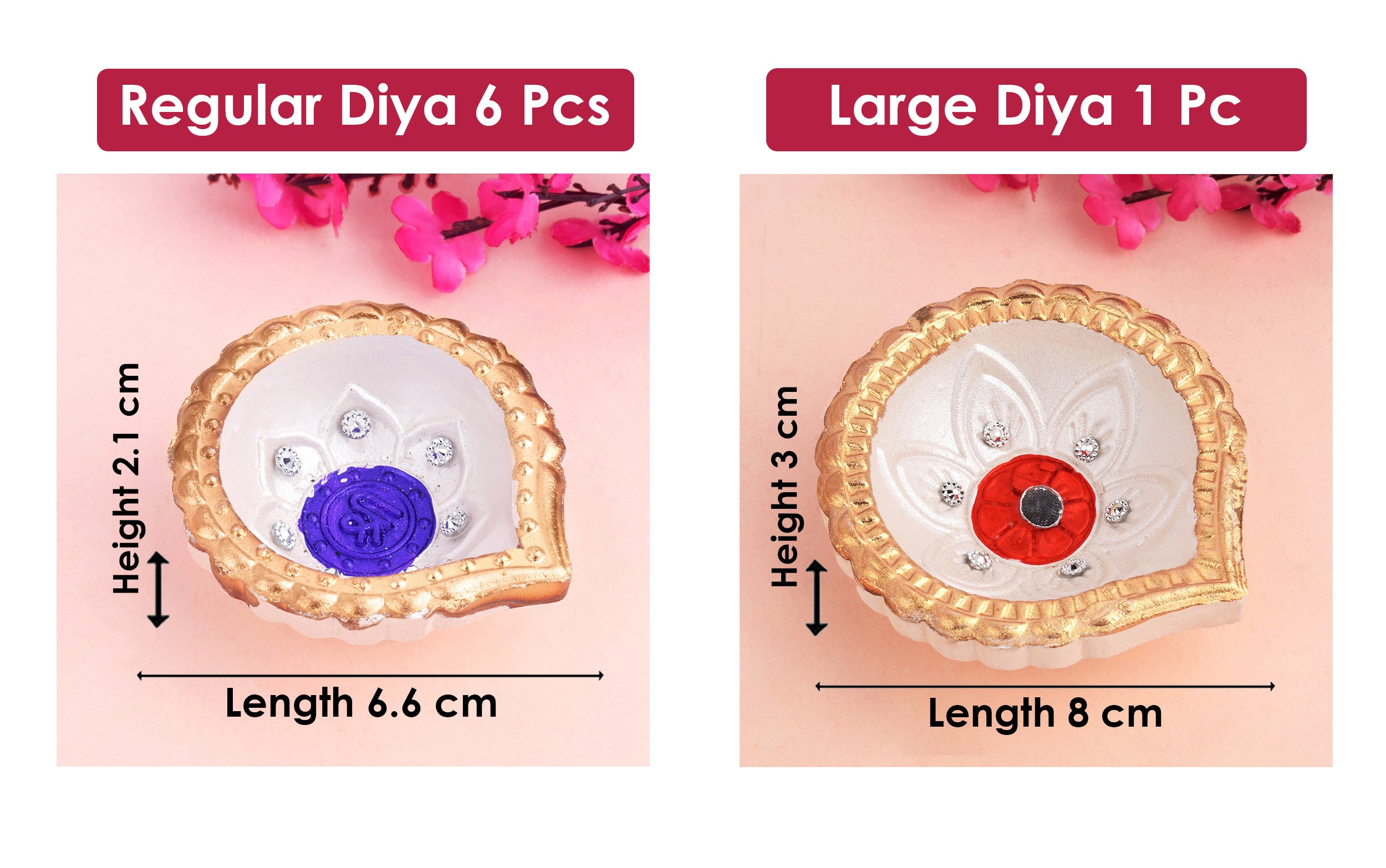 • Product Details: Material: Clay/Terracotta Dimensions: Regular Diya Height: 2.1cm, Length: 6.6cm, Large Diya Height: 3cm, Length: 8cm,Β Weight: 700gram, Finish Type: Glossy.
