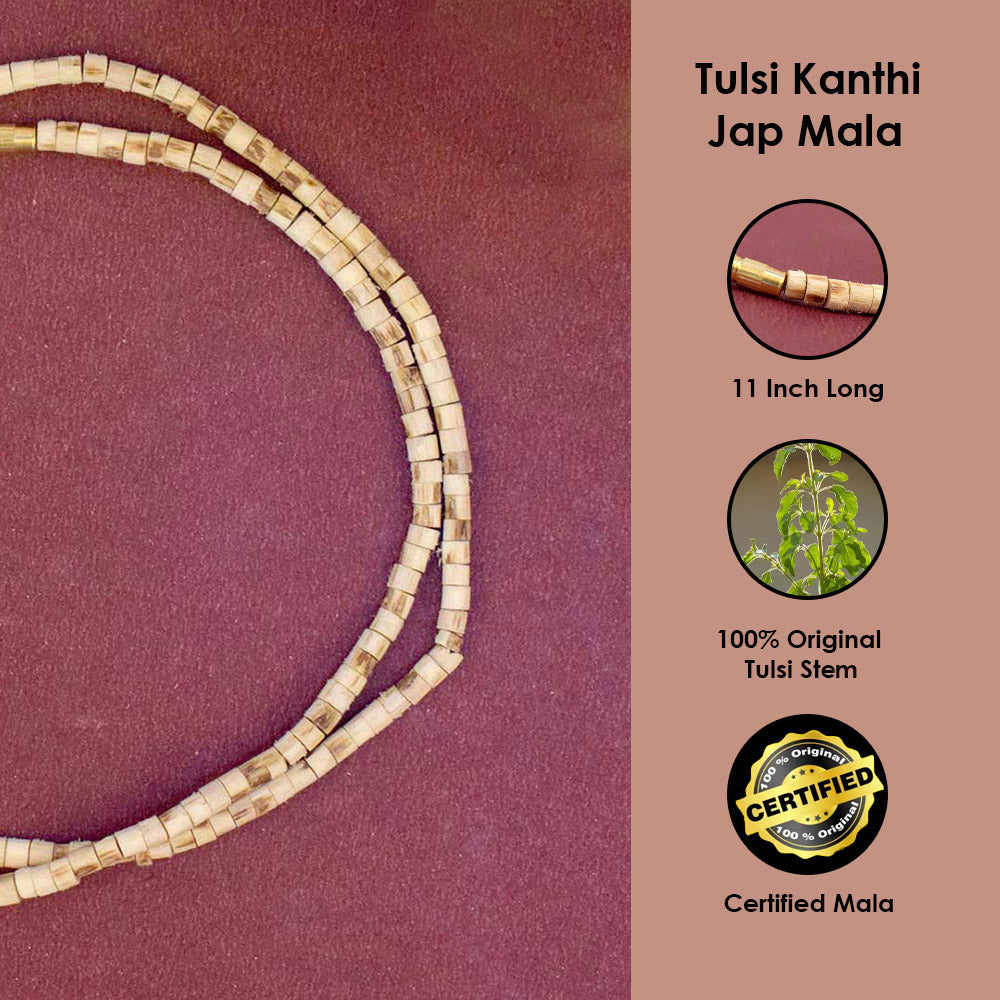 A Tulsi Mala is a string of beads made from the wood of the sacred Tulsi plant (Ocimum sanctum). It is widely used in Hinduism, Jainism, and Buddhism for chanting (Japa) and wearing as a protective necklace. The power of Tulsi Mala is believed to enhance spirituality, bring inner peace, and protect the wearer from negative energies.