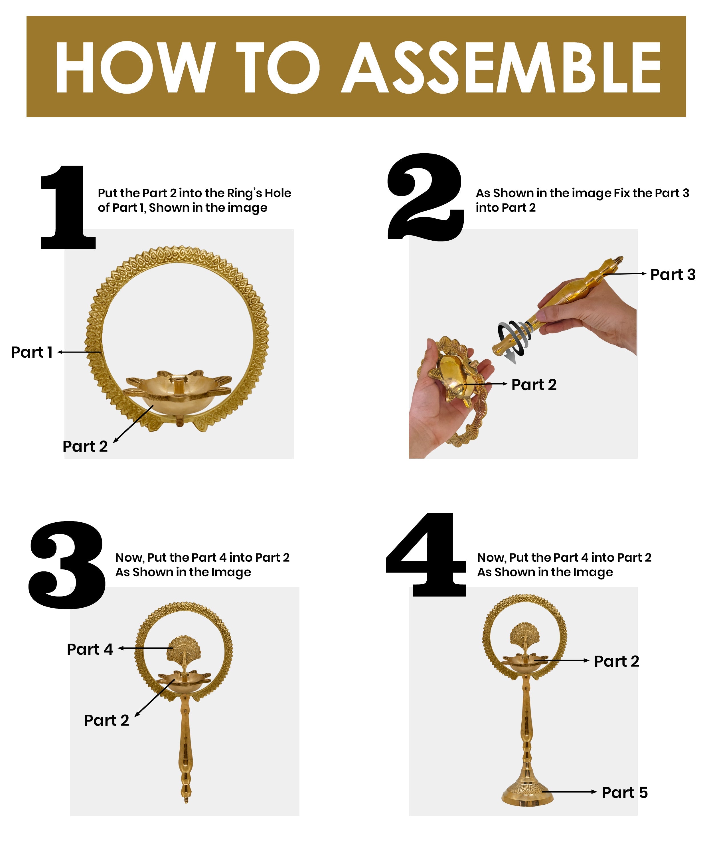 • Size/ Dimension: Height: 42.5 cm, Ring Diameter: 17 cm, Dia Length: 11.5 cm. Follow the instruction carefully mentioned in the 3rd Image While assembling the Peacock Diya.