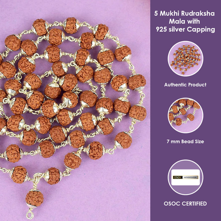 Certified 5 Mukhi Rudraksha Mala with 925 silver Capping