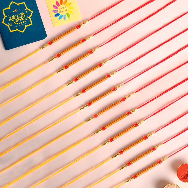 Beaded Bhaiya Rakhi Set of 2: Bedecked with colorful beads, these rakhis represent the joyous moments and cherished memories of growing up together. Embrace nostalgia and affection with this delightful beaded rakhi set.